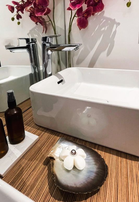 NOTRE SAVON EN FORME DE FLEUR DE TIARÉ, ORNÉ D'UNE PERLE NOIRE DE TAHITI